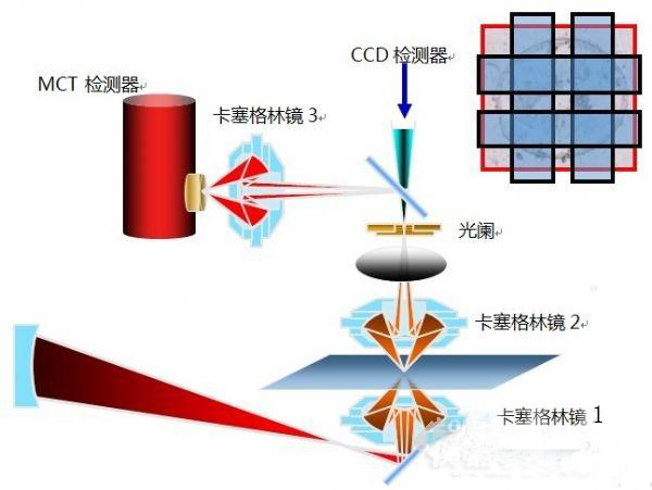 在紅外顯微鏡和紅外成像系統(tǒng)測(cè)試中,通過(guò)特殊設(shè)計(jì)的光學(xué)系統(tǒng)將測(cè)量光束直徑縮小到微米甚至亞微米量級(jí),從而可測(cè)試尺寸非常小的樣品或者是大尺寸樣品中非常小的區(qū)域,顯然此時(shí)光通量遠(yuǎn)遠(yuǎn)小于常規(guī)紅外光譜儀,若要獲得高的信噪比,對(duì)整體光學(xué)系統(tǒng)的光路系統(tǒng)要求相應(yīng)也有很大的很高,通常需要多個(gè)光學(xué)聚焦鏡(卡塞格林鏡)聯(lián)合使用,才能保證紅外光同軸,且能量損失最小,如圖1所示為PerkinElmer公司紅外光譜成像系統(tǒng)中的三卡塞格林鏡光學(xué)系統(tǒng)。