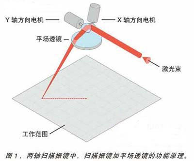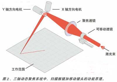 一套基本的x-y掃描裝置看起來很簡(jiǎn)單:兩塊反射鏡,由電機(jī)驅(qū)動(dòng),可將入射激光束反射到特定區(qū)域(工作區(qū)域)的任何點(diǎn)。一組平場(chǎng)(f-?)透鏡確保焦點(diǎn)在工作區(qū)域平面內(nèi)(二軸系統(tǒng),如圖1),對(duì)基本的Nd:YAG激光器來說,典型的工作范圍為40×40平方毫米(ff-?=100?毫米)至180×180?平方毫米(ff-?=254?毫米;對(duì)于高級(jí)諧波激光器和二極管激光器,其工作范圍為40×40?平方毫米(ff-?=100?毫米)至120×120平方毫米(ff-?=163?毫米),具體取決于平場(chǎng)透鏡的焦距。顯然,所需工作范圍越大,工作距離越長。如果在掃描振鏡前端的激光光路中,使用聚焦透鏡和可移動(dòng)透鏡的組合來代替平場(chǎng)透鏡,工作范圍和工作距離還會(huì)進(jìn)一步增加(三軸系統(tǒng),如圖2)。該裝置可使工作范圍達(dá)到1200×1200平方毫米,工作距離達(dá)到1500毫米。