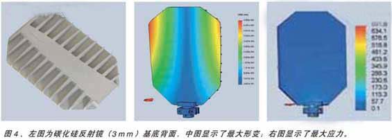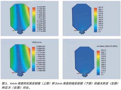 以硅為基底,可以減小反射鏡厚度(重量),同時(shí)形變、應(yīng)力和較厚的石英基底反射鏡相同(見圖3)然而,由于該反射鏡系統(tǒng)重量,應(yīng)力和形變?nèi)匀惠^大。硅基底仿真圖表明慣量和重量都降低15%,頻率幾乎保持不變。