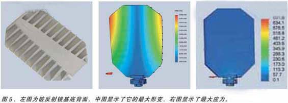 另外,基于模型計(jì)算優(yōu)化后的參數(shù)可確保最優(yōu)設(shè)計(jì)。由于較低密度和相對(duì)重量較高的楊氏模量值,鈹模型相對(duì)碳化硅模型的設(shè)計(jì)更為簡(jiǎn)便。該材料的另一優(yōu)點(diǎn)是其吸附能力。對(duì)比碳化硅和鈹反射鏡,鈹模型比碳化硅少兩個(gè)臨界頻率。這將為伺服電路板和振鏡電機(jī)提供更為簡(jiǎn)便的自動(dòng)控制能力。結(jié)果是鈹反射鏡相對(duì)碳化硅反射鏡,重量減少35%,慣量減少35%。反射鏡設(shè)計(jì),最大形變和最大應(yīng)力如圖5所示。