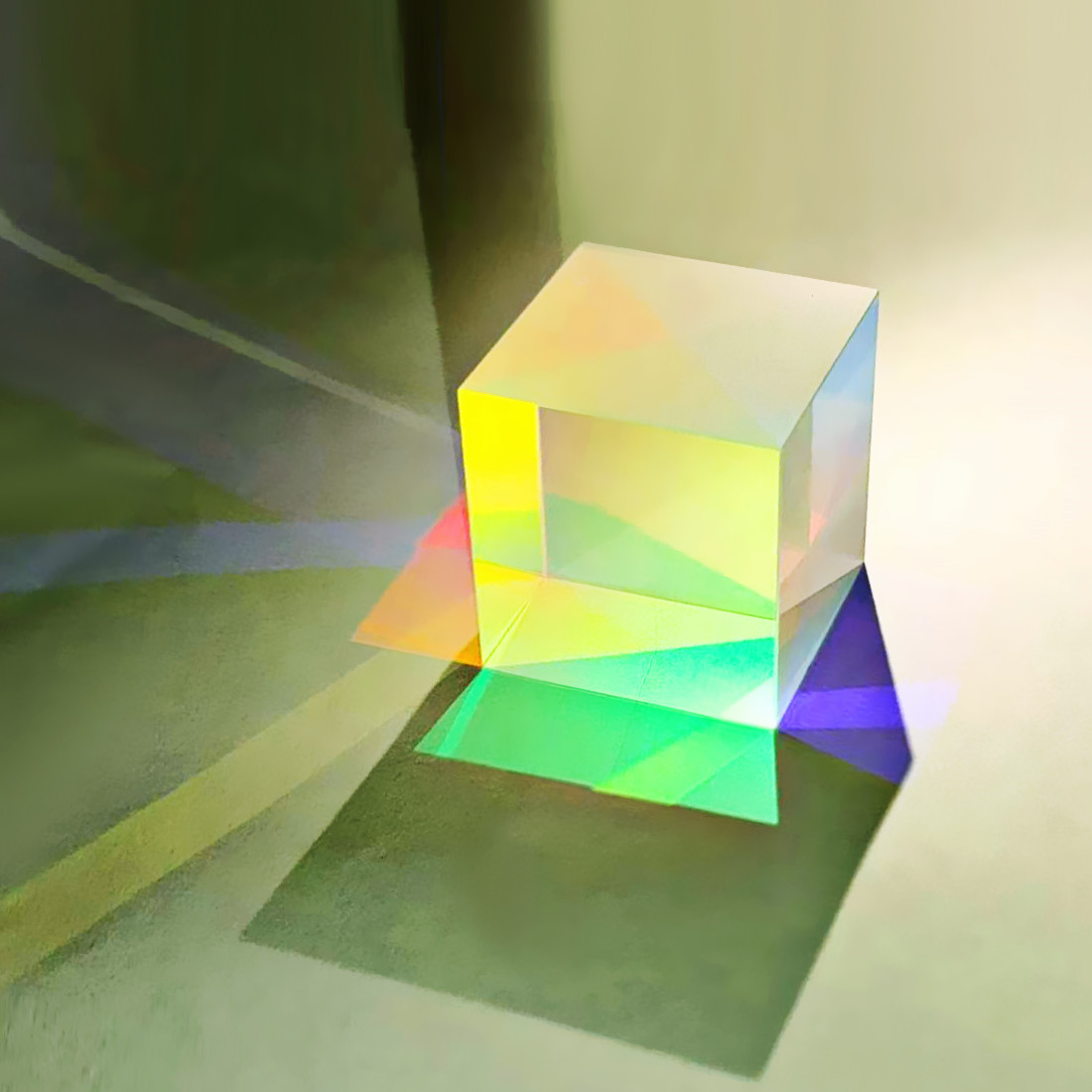 從上邊來(lái)看,合色棱鏡對(duì)光具有分光和折射的作用。當(dāng)我們使用白光照射時(shí),棱鏡通過(guò)折射使不同波長(zhǎng)(即顏色)的光分開,再加上不同反射膜的反射作用,最終呈現(xiàn)出漂亮的光學(xué)現(xiàn)象。