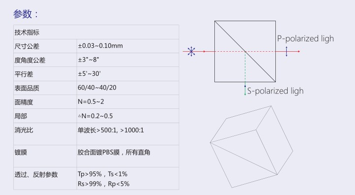 偏振分光棱鏡 產(chǎn)品介紹: 偏振分光棱鏡能把入射的非偏振光分成兩束垂直的線偏光。其中P偏光完全通過(guò),而S偏光 以45度角被反射 產(chǎn)品介紹: 偏振分光棱鏡能把入射的非偏振光分成兩束垂直的線偏光。其中P偏光完全通過(guò),而S偏光 以45度角被反射,出射方向與P光成90度角。此偏振分光棱鏡由一對(duì)高精度直角棱鏡膠合而 成,其中一個(gè)棱鏡的斜邊上鍍有偏振分光介質(zhì)膜。 You might like 膠合棱鏡 直角棱鏡 棱鏡 轉(zhuǎn)向棱鏡