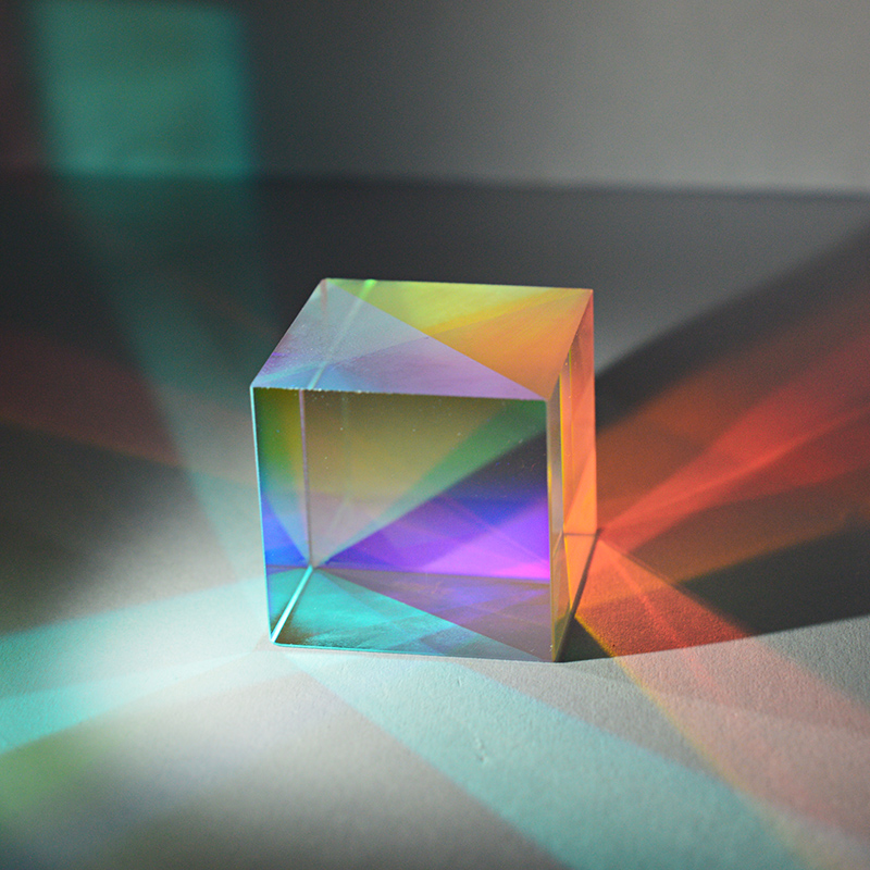 從上邊來(lái)看,合色棱鏡對(duì)光具有分光和折射的作用。當(dāng)我們使用白光照射時(shí),棱鏡通過(guò)折射使不同波長(zhǎng)(即顏色)的光分開,再加上不同反射膜的反射作用,最終呈現(xiàn)出漂亮的光學(xué)現(xiàn)象。