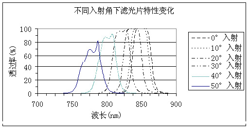 假如入射光線(xiàn)與濾光片的法線(xiàn)夾角有一定規(guī)模,那么要指明這個(gè)夾角的詳細(xì)規(guī)模,因?yàn)楦缮鏋V光片的規(guī)劃對(duì)視點(diǎn)十分敏感,關(guān)于0°下規(guī)劃的窄帶濾光片,假如在不同視點(diǎn)下運(yùn)用,其作用是完全不同的。圖3是以850nm窄帶濾光片為例,當(dāng)入射視點(diǎn)增大時(shí),中心波長(zhǎng)的方位不斷向短波移動(dòng)。只要是干涉濾光片,這個(gè)視點(diǎn)效應(yīng)無(wú)法避免,這是干涉濾光片的根本特性。從圖中可以看出,當(dāng)一個(gè)850nm的窄帶濾光片在50°下運(yùn)用時(shí),它不再是一個(gè)850nm的窄帶濾光片,而變成了770nm的窄帶濾光片。有些用戶(hù)會(huì)反映,在用廣角鏡頭拍照物體時(shí),加了窄帶濾光片后,發(fā)現(xiàn)只能拍到中心部分的物體,邊上的都很暗,認(rèn)為窄帶濾光片只有中心透,邊緣不透,這種認(rèn)識(shí)是不對(duì)的,窄帶濾光片整個(gè)表面都是均勻的,主要還是因?yàn)榇笠朁c(diǎn)入射時(shí),濾光片的透光波段向短波移了,而短波部分又沒(méi)有光源造成的。